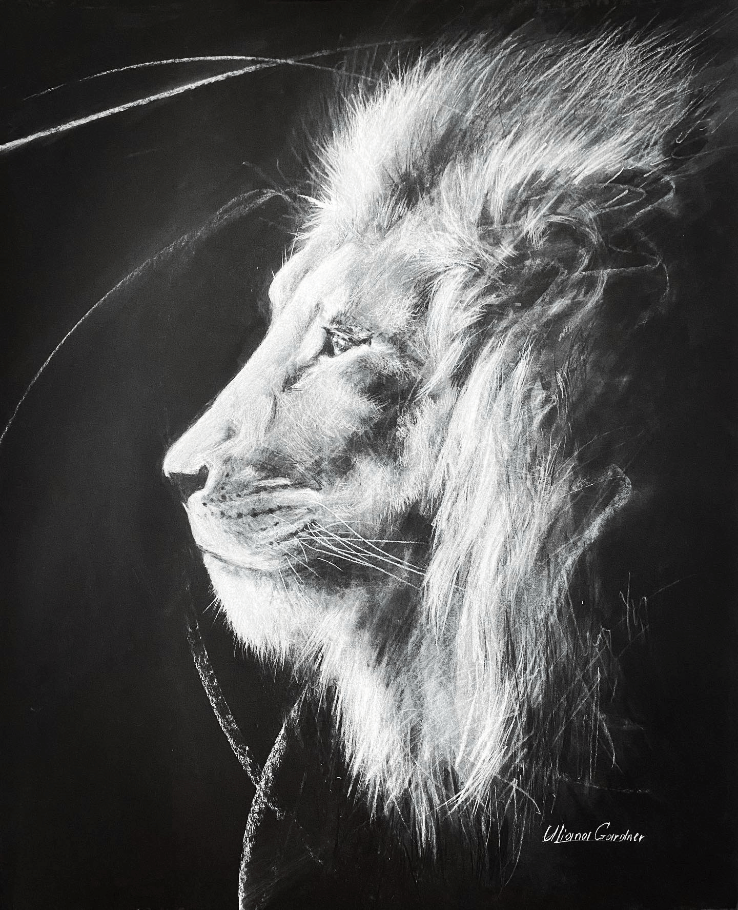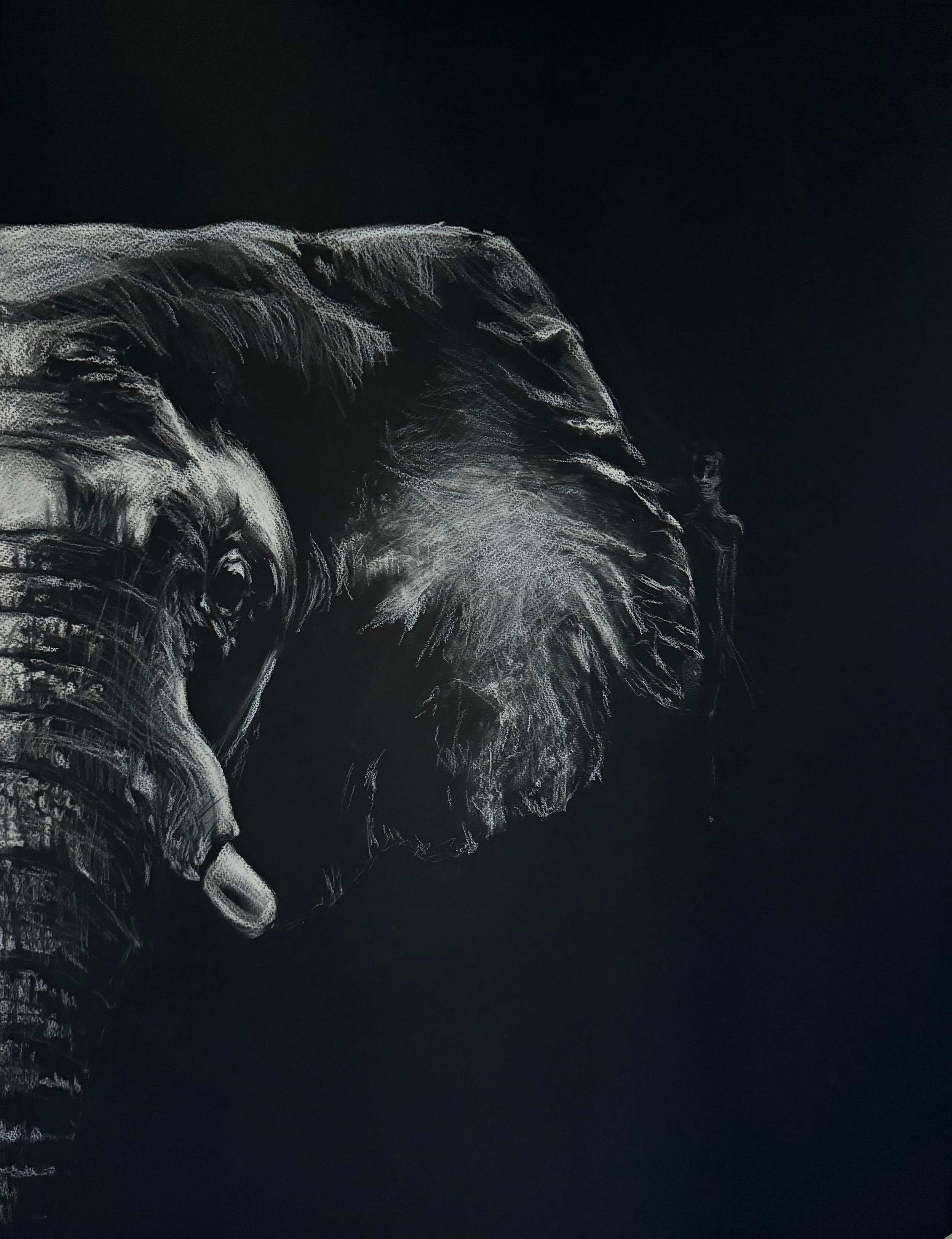 A series of expressive portraits capturing the presence, strength, and quiet dignity of wild animals. Drawn in white charcoal on black paper, each figure emerges from darkness through light, revealing both physical power and an inner stillness.